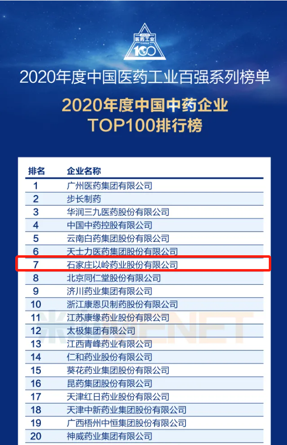 “2020年度中国中药企业TOP100排行榜”公布,以岭药业位居第七位