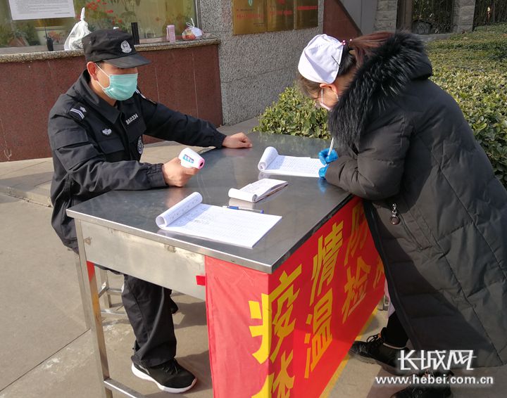 以岭药业员工进入厂区前进行登记、测量体温。 记者 吴新光 李代姣 摄