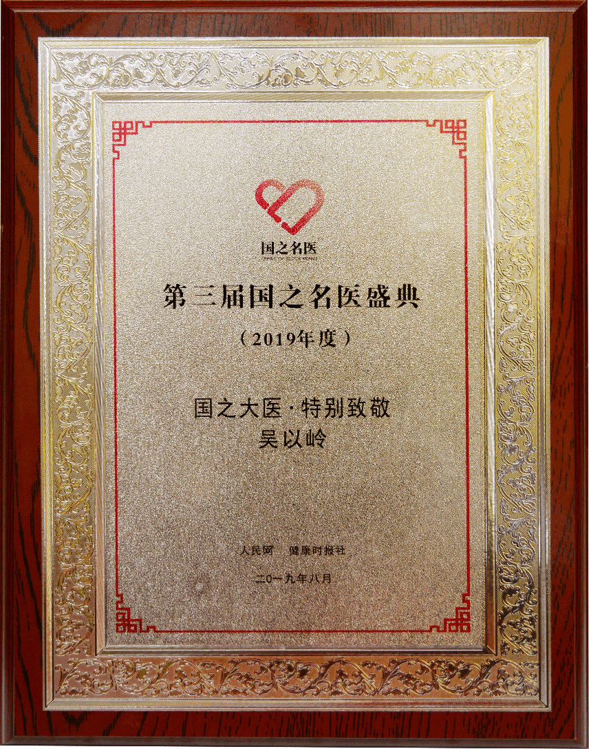 推举医者榜样,引领尊医舆论,促进人民健康。2019年8月9日,第三届国之名医盛典在人民日报社举行,吴以岭教授荣获“国之大医·特别致敬”荣誉称号。