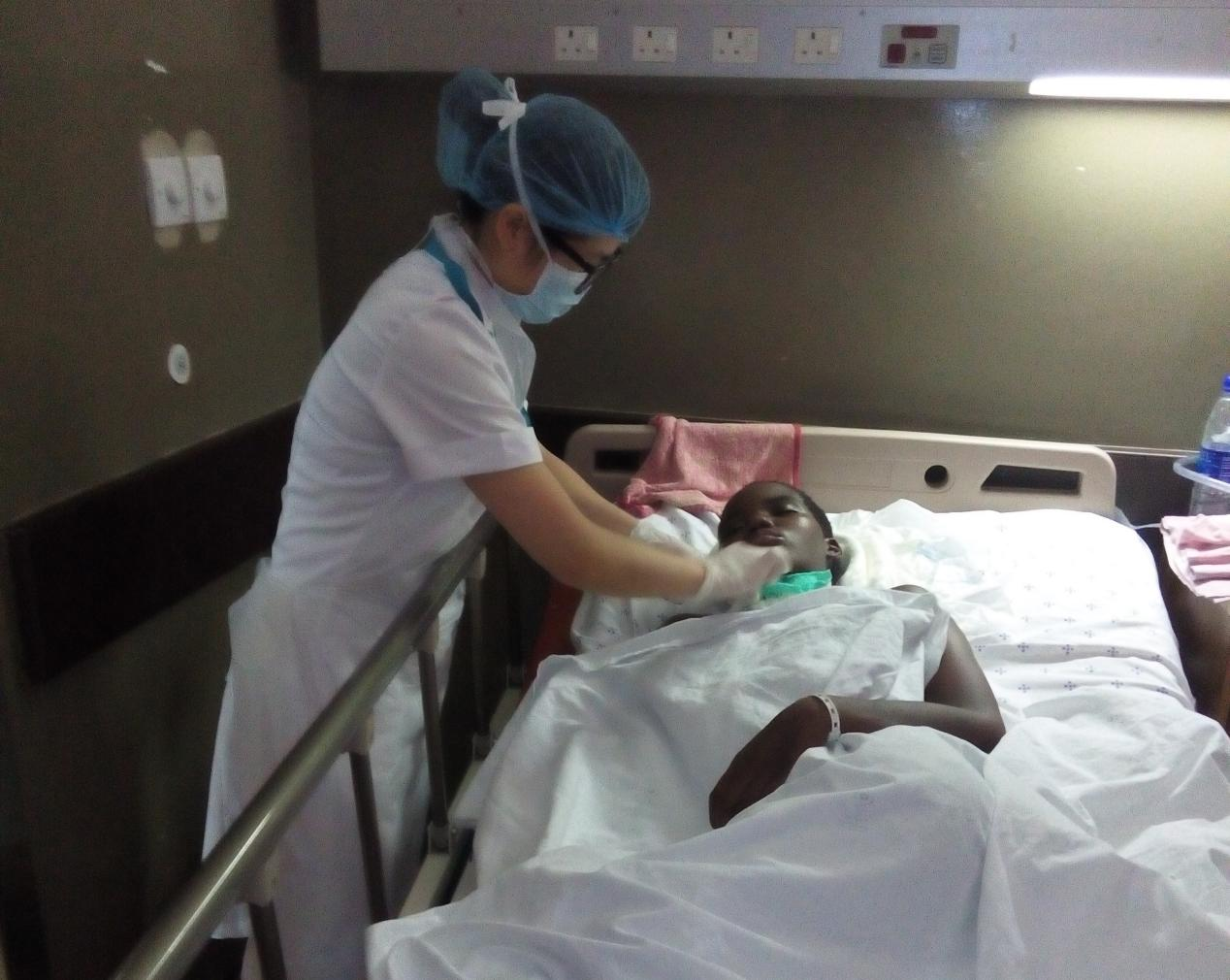 陈明升的妻子范婷婷正在照顾博茨瓦纳的病人