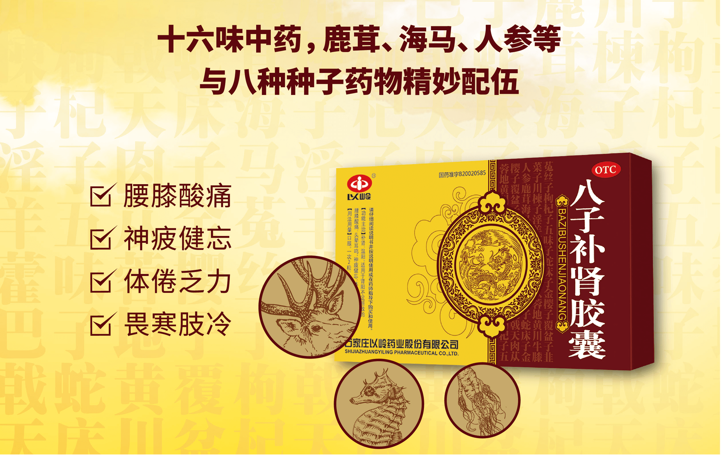 【成 份】菟丝子、枸杞子、五味子、蛇床子、金樱子、覆盆子、韭菜子、川楝子、淫羊藿、巴戟天、肉苁蓉、地黄、川牛膝、人参、鹿茸、海马