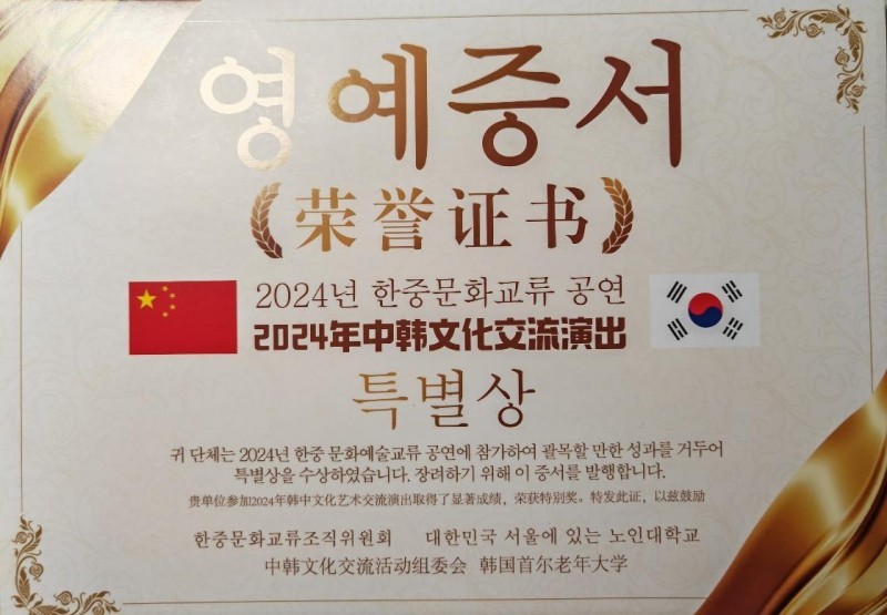 中华养生通络操成都代表团荣获2024年中韩文化交流演出荣誉证书