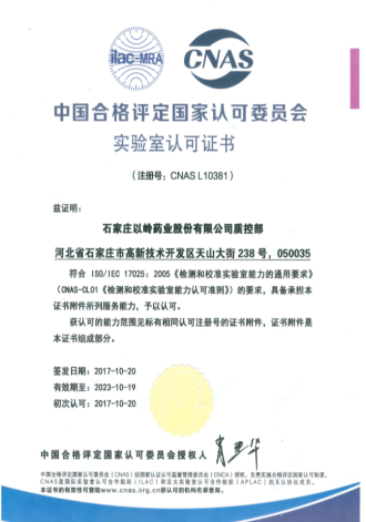 2017年以岭质控中心获“中国合格评定国家认可委员会(CNAS)”认证,84项检测项目参数获得认可,检验标准涵盖美国药典、中国药典、国家食品药品监管标准,检测报告得到国内外治疗管理体系认证和环境管理体系认证认可机构互认。